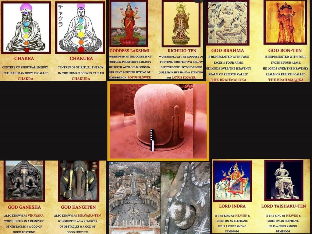 जैसे वहाँ कांजीतेन भगवान की पूजा की जाती है जिनकी मूर्ति गणेश जी के समान है, उन्हें बिनायकतेन ( विनायक) कहा जाता है और ऐसी मान्यता है कि ये विघ्न हर के समृद्धि का आशीर्वाद देते हैं। इसी प्रकार वहाँ बॉनतेन भगवान (ब्रह्मा) की पूजा होती है जिनकी मूर्ति के चार सिर और चार हाथ होते हैं और ऐसा माना जाता है कि ये ब्रह्मलोक में निवास करते हैं। जापानी ताईशाकूतेन (इंद्रदेव) की पूजा करते हैं जो हाथी की सवारी करते हैं और मान्यता है कि वे स्वर्गलोक के राजा हैं। इसी प्रकार जापान में किच्चिजोतेन देवी (लक्ष्मी) की पूजा की जाती है जो कमल के फूल पर विराजमान हैं और इन्हें भाग्य और ऐश्वर्य की देवी माना जाता है। यह तो हुई सनातन धर्म से समानता की बात। अगर आध्यात्मिक ज्ञान और भारतीय दर्शन की बातकरें तो भारतीय वांग्मय में मानव शरीर की आत्मिक ऊर्जा का केंद्र चक्रों को माना गया है और सात प्रमुख चक्र उल्लेख हैं। जापान की रेकी विद्या और इन चक्रों में भी काफी समानता पाई गई है।