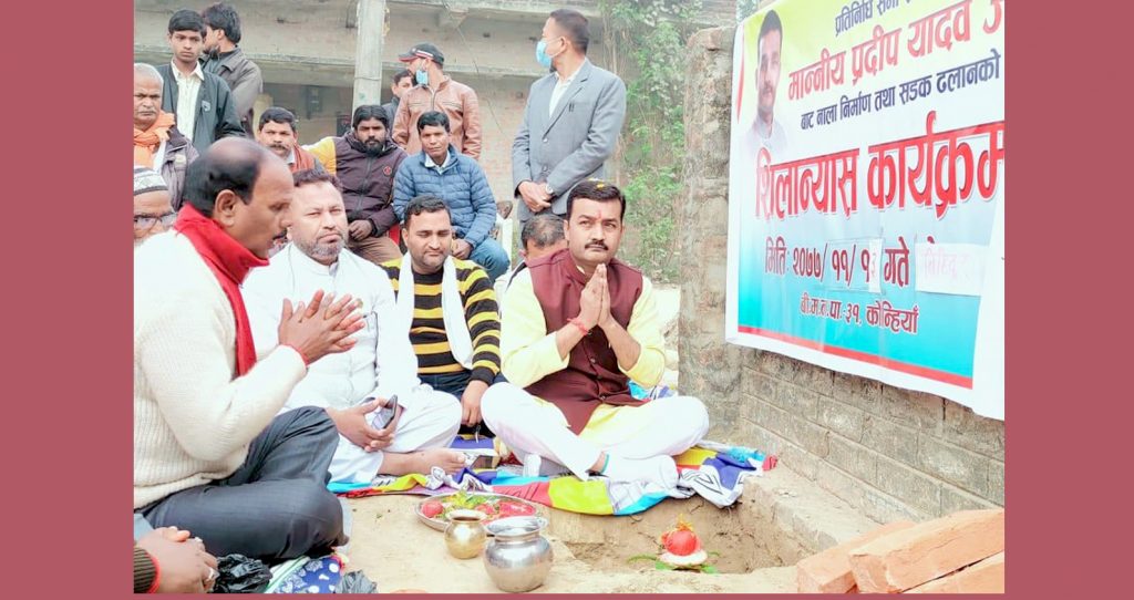 वीरगञ्ज । २६ फरवरी । वीरगंज महानगरपालिका–३१ कोन्हिया में निर्माणाधीन नाला और ढलान सड़क को पर्सा निर्वाचन क्षेत्र नं. १ से निर्वाचित सांसद् प्रदीप यादव ने शिलान्यास किया है । बिहिबार आयोजित एक विशेष कार्यक्रम के दौरान यह शुभ–कार्य सम्पन्न हुआ है । स्मरयणीय है, संसदीय विकास कोष से ५० लाख और जनश्रमदान से १२ लाख इकठ्ठा कर कूल ६२ लाख की लागत में कोन्हिया में नाला और सडक ढलान का काम हो रहा है ।