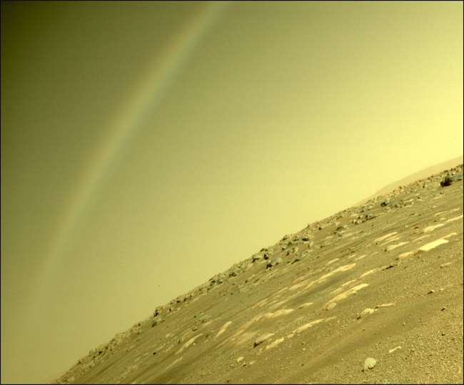 मंगल पर भेजे गए नासा के मार्स रोवर परसिवरेंस ने वहां के आसमान में एक कमाल की फोटो खींची है। इसमें मंगल के आसमान में इंद्रधनुष बना हुआ दिखाई दे रहा है, जो कि बेहद खूबसूरत भी है। ये पहला मौका है जब किसी रोवर ने धरती से इतनी दूर इस तरह की कोई चीज को कैमरे में कैद किया है। नासा की तरफ से इसकी जानकारी ट्वीट कर दी गई है। साथ ही कहा गया है कि बहुत लोगों का कह रहे हैं कि क्या ये लाल ग्रह पर इंद्रधनुष है। इसके जवाब में नासा ने कहा है कि नहीं। नासा के मुताबिक मंगल ग्रह पर इंद्रधनुष हो ही नहीं सकता है।