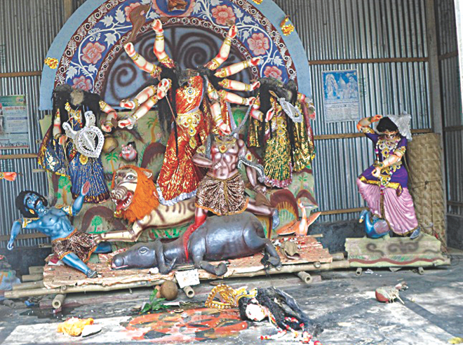 बांग्लादेश में दुर्गा पूजा समारोहों के दौरान कुछ अज्ञात मुस्लिम उपद्रवियों ने हिंदुओं के कुछ मंदिरों को क्षतिग्रस्त कर दिया, जिसके चलते सरकार को 22 जिलों में अर्द्धसैनिक बलों की तैनाती करनी पड़ी है। खबरों के अनुसार बुधवार को कमीला की सीमा से लगे चांदपुर के हाजीगंज उपजिले में पुलिस और मुस्लिम उपद्रवियों के बीच संघर्ष के दौरान तीन लोग मारे गए, वहीं एक अन्य शख्स की बाद में मौत हो गई। अधिकारियों ने हाजीगंज में रैलियों पर प्रतिबंध लगा दिया है जहां अधिकारियों ने गोली लगने से चार लोगों की मौत की पुष्टि की है। मुस्लिम बहुल बांग्लादेश की 16.9 करोड़ की आबादी में करीब 10 प्रतिशत लोग हिंदू हैं। पिछले कुछ वर्षों में छिटपुट हिंसा की घटनाएं होती रही हैं, जिनमें से ज्यादातर सोशल मीडिया के जरिए अफवाह फैलाने से हुईं।