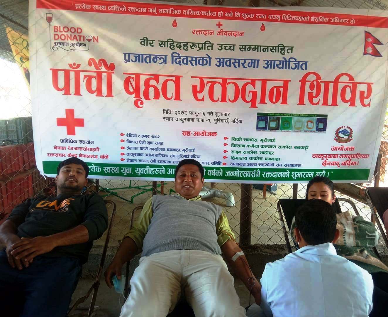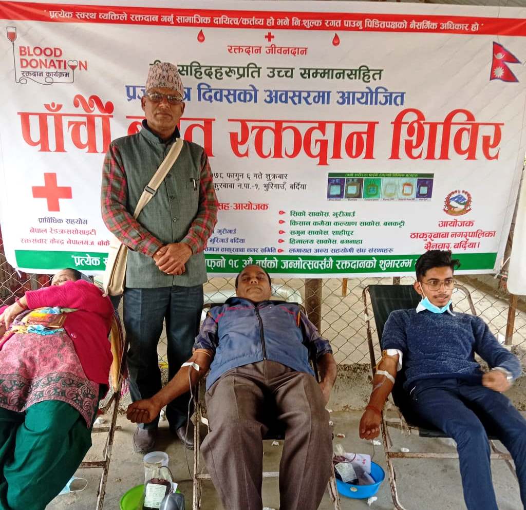 वह रक्तदान कार्यक्रम में नेपाल स्वयंसेवी रक्तदाता समाज बर्दिया के अध्यक्ष प्रेम प्रसाद लम्साल, ठाकुरबाबा नगरपालिका स्वास्थ शाखा प्रमुख इन्द्र बहादुर राजबंशी की सक्रिय सहयोग रही थी । वीर शहिदाें के प्रति उच्च सम्मान सहित प्रजातन्त्र दिवस के अवसर पर फागुन ६ गते गते शुक्रवार को आयोजित रक्तदान कार्यक्रम में रेडियो टाइगर, विकास प्रेमी युवा समूह, ईलाका प्रहरी कार्यालय बगनाहा भुरीगावँ, ठाकुरबाबा उद्योग वाणिज्य संघ भुरीगावँ, नेपाल स्वयंसेवी रक्तदाता समाज ठाकुरबाबा नगर समिति, सिको साकोस भुरीगावँ, किसान कमैया कल्याण साकोस बनकट्टी, सुमन साकोस शाहीपुर हिमालय साकोस बगनाहा लगायत नौ संघ संस्थाएँ की सह–आयोजन में रक्तदान कार्यक्रम सम्पन्न हुा है वह कार्यक्रम में व्यापारी, स्वयंसेवी रक्तदाता, समाजसेवी, युवा, पत्रकार लगायत १ सौ ८ लोगों ने रक्तदान किया ।