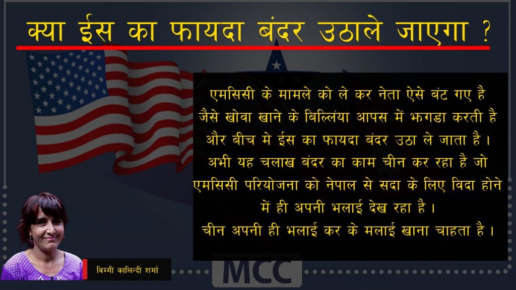यदि एमसिसी परियोजना नेपाल में शुरु हो गया तो अमेरिकी सेना नेपाल में आ जाएगें और नेपाल और चीन दोनो को परेशान करेगा । यही डर दिखा कर नेपाल से एमसिसी को अमेरिका वापस करने के लिए सारी कवायद हो रही है । अमेरिकी सेना नेपाल के बहाने कंही तिब्बत की ओर आंख न उठा ले ईसी डर से चीन शकुनी कि तरह पाशे फेंक रहा है और नेपाल दुर्योधन बन गया है । पूरा देश रणभूमि बन गया हे विदुर तो कोई है नहीं सब कंही न कंही से प्रायोजित है भिष्म कि तरह नमक खा कर मौन है । ईस महाभारत को अंत करने के लिए कृष्ण चाहिए पर यंहा तो अर्जुन और गाडिंव दोनों नदारद है ।