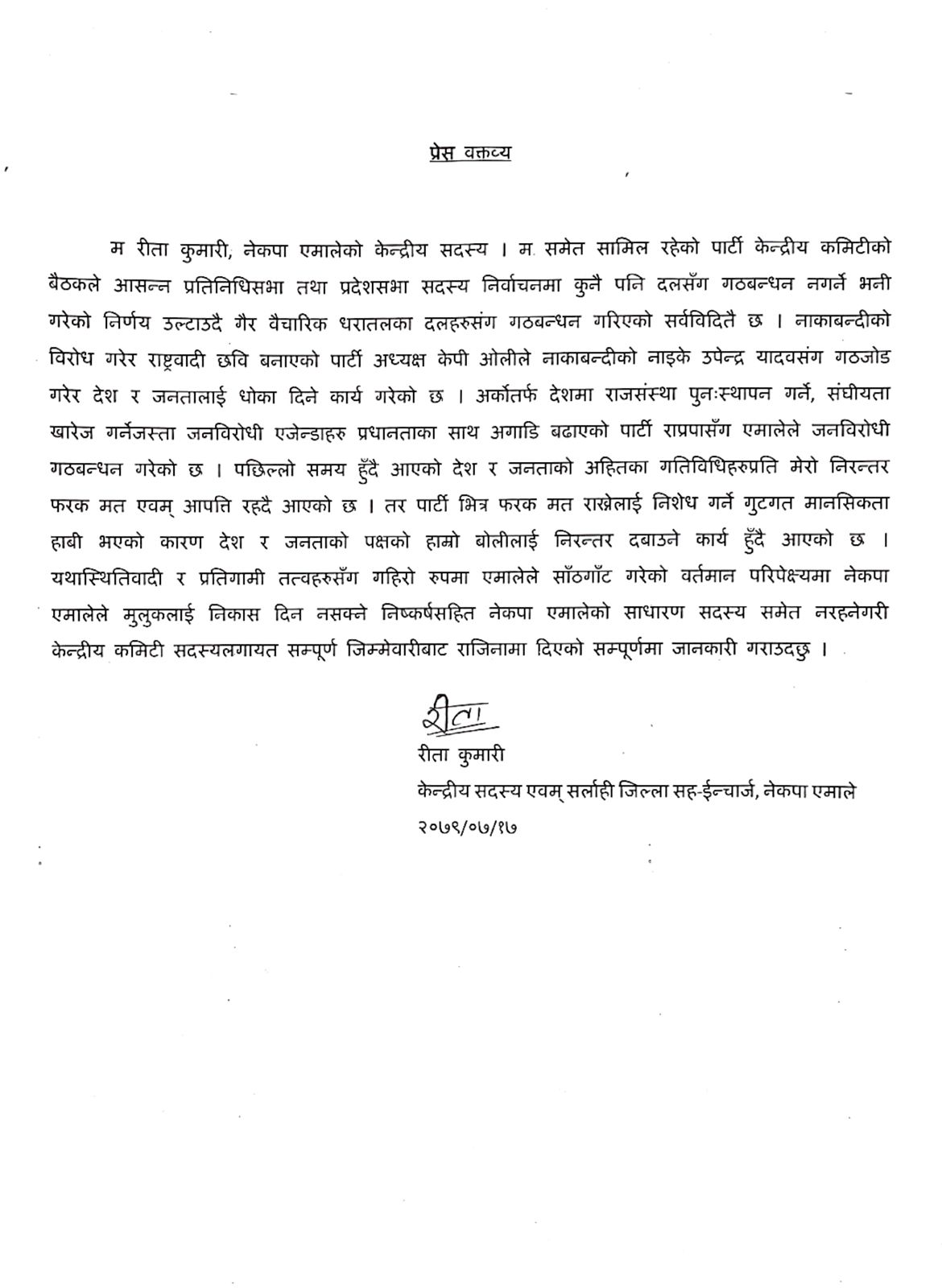 जनकपुरधाम /मिश्री लाल मधुकर । नेकपा एमाले के केन्द्रीय सदस्य तथा सर्लाही जिला के सह इंचार्ज रीता कुमारी ने एमाले से प्राथमिक सदस्य भी इस्तीफा दे दिया है। उन्होंने एक प्रेस विज्ञप्ति जारी कर राजीनामा की घोषणा की हैं। उन्होंने प्रेस विज्ञप्ति में उल्लेख किया हैं कि ओली ने प्रतिनिधि सभा तथा प्रदेश सभा में किसी दल के साथ गठबंधन न करने की प्रतिबद्धता जाहिर किया था। इसके बाद नाकाबंदी कर नेपाली जनता को दुख पहुंचाने बाले तथा मधेशी पहाड़ी के बीच नफरत फैलाने बाले जनता समाजवादी पार्टी से गठबंधन किया है। इसी तरह राजतंत्र के पोषक तथा संघीयता बिरोधी राप्रपा से सांठगांठ कर लाखो एमाले कार्यकर्ता के योगदान को कुठाराघात किया है। ऐसी स्थिति में पार्टी में रहना उचित नहीं है।