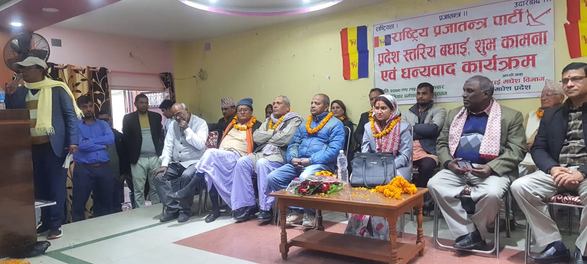 जनकपुरधाम /मिश्री लाल मधुकर । राष्ट्रीय प्रजातंत्र पार्टी (हल) ने निर्वाचित प्रदेश सांसदके सम्मान के लिए प्रदेश स्तरीय बधाई एवं शुभकामना कार्यक्रम शुक्रवार को आयोजित की गयी। इस कार्यक्रम की अध्यक्षता तराई मधेश प्रमुख राम प्रताप साह (भोला) ने किया। अपने अध्यक्षीय भाषण में उन्होंने कहा कि पार्टी की संगठन पर बिशेष जोर दिया जाएगा। प्रमुख अतिथि बिधायक कंचन बिच्छा साह ने कहा कि पार्टी की मजबूती के साथ पार्टी की एजेंडा को प्रदेश सभा में रखेंगे। कार्यक्रम में पार्टी केपूर्व केंद्रीय सदस्य तथा ट्रेड यूनियन के सदस्य नथुनी लाल दास, पूर्व केन्द्रीय सदस्य श्रवण कुमार झा धनुषा जिला अध्यक्ष राम चंद्र यादव, सर्लाही जिला अध्यक्ष सत्य नारायण यादव, धनुषा जिला के युवा अध्यक्ष मन्नू झा, प्रदेश सदस्य नीरू केसी, केन्द्रीय सदस्य राम नारायण साह, धनुषा जिला उपाध्यक्ष राम नारायण ठाकुर सहित कई लोगो ने विचार रखें। अतिथियों का स्वागत क्षेत्रीय अध्यक्ष असर्फी झा ने किया वहींमंच संचालन राम चंद्र मुखिया नेकीं। उपस्थित लोगो ने राष्ट्र निर्माता पृथ्वी नारायण शाह के तस्वीर पर माल्यार्पण किया।