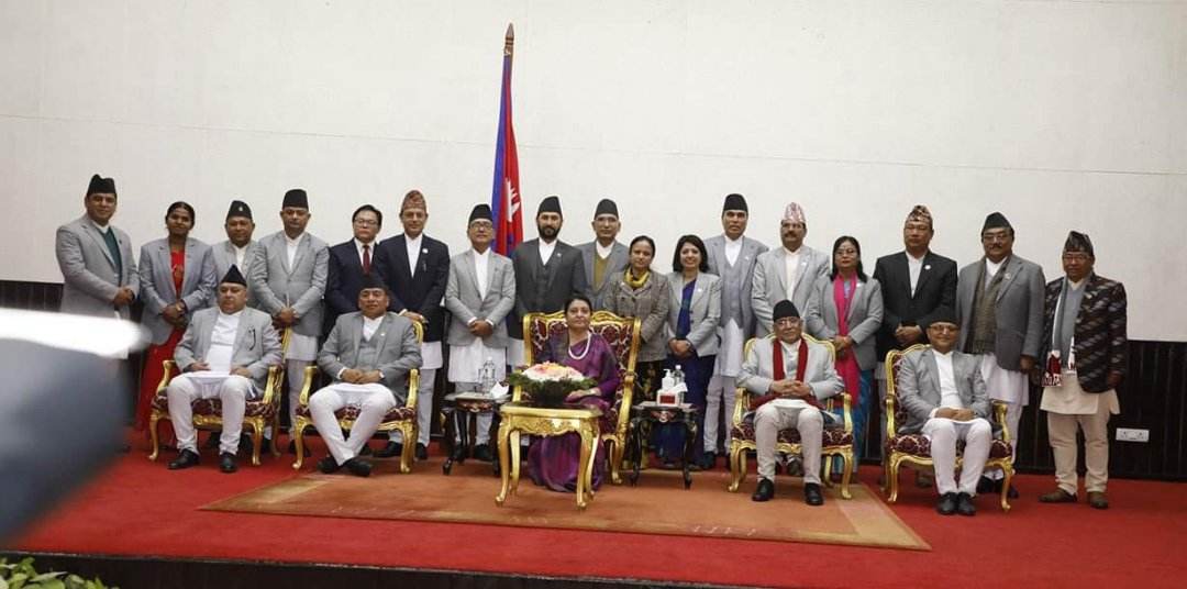 नेकपा एमाले, नेकपा माओवादी केन्द्र, राष्ट्रीय स्वतन्त्र पार्टी और राष्ट्रीय प्रजातन्त्र पार्टी से बने मंत्रियों ने राष्ट्रपति कार्यालय में पद तथा गोपनीयता की शपथ ली है । राष्ट्रीय प्रजातंत्र पार्टी के अध्यक्ष राजेन्द्र लिङ्देन ने उपप्रधानमन्त्री तथा ऊर्जा तथा जलस्रोत मन्त्री की शपथ ली है ।