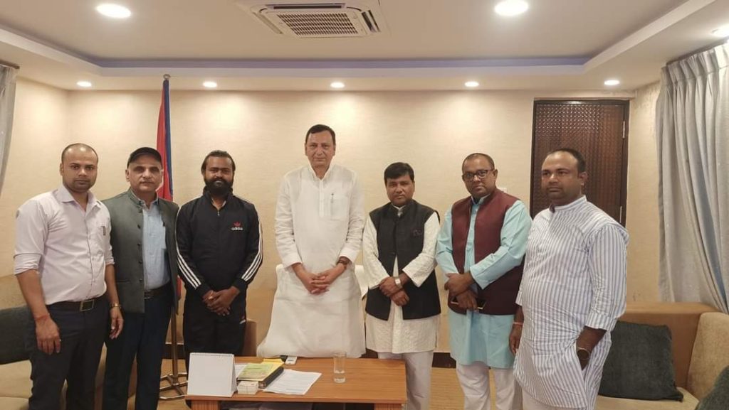 जनकपुरधाम/मिश्री लाल मधुकर। बारहवीघा (रंगभूमि)को सौन्दर्यीकरण हेतु गुरुवार को जनकपुरधाम के मेयर मनोज कुमार साह ने मुख्यमंत्री सरोज कुमार यादव से मुख्यमंत्री आवास पर एक शिष्टमंडल के साथ मुलाकात की।मेयर रामायणकालीन बारहवीघा (रंगभूमि)को सौन्दर्यीकरण हेतु पहल करने के लिए आग्रह किया। मुख्यमंत्री सरोज कुमार यादव ने बहुत जल्द ही डीपीआर तैयार करने का आश्वासन दिया। बारहवीघा(रंगभूमि) मैदान की चहारदीवारी, मैदान में मिट्टी भराई, जगह जगह मास्क लाइट, रामायण से जुड़ी भित्ति चित्र सहित कई अन्य काम होना है। मेयर के साथ जनकपुरधाम उद्योग बाणिज्य संघ के अध्यक्ष जीतेन्द्र महासेठ, बार्डाध्यक्ष परमेश्वर साह, नेपाली कांग्रेस के जिला उपाध्यक्ष गणेश झा, जीतेन्द्र साह आदि थे।