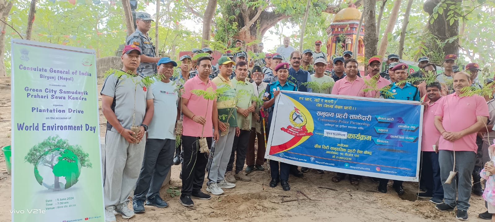 5 जून 2024 को “विश्व पर्यावरण दिवस” के अवसर पर ग्रीन सिटी सामुदायिक पुलिस सेवा केंद्र, बीरगंज के सहयोग से भारत के महावाणिज्य दूतावास, बीरगंज (नेपाल) द्वारा वृक्षारोपण अभियान का आयोजन किया गया था। परसा जिले के मुख्य जिला अधिकारी श्री दिनेश सागर भुसाल, सशस्त्र पुलिस बल के पुलिस अधीक्षक श्री राधेश्याम धीमाल और बीरगंज में भारत के महावाणिज्य दूत श्री डी. एस मीना जी ने वृक्षारोपण अभियान में भाग लिया। परसा जिला प्रशासन कार्यालय और सशस्त्र पुलिस बल और नेपाली सेना के अन्य वरिष्ठ अधिकारी और अधिकारी; ग्रीन सिटी सामुदायिक पुलिस सेवा केंद्र के सदस्यों, हरि खेतान बहुउद्देशीय परिसर और नवदीप अकादमी के बड़ी संख्या में शिक्षकों, छात्रों और छात्रों और नागरिक समाज के सदस्यों ने ऐतिहासिक विसुवा डांडा (बीरगंज) में वृक्षारोपण अभियान में भाग लिया।