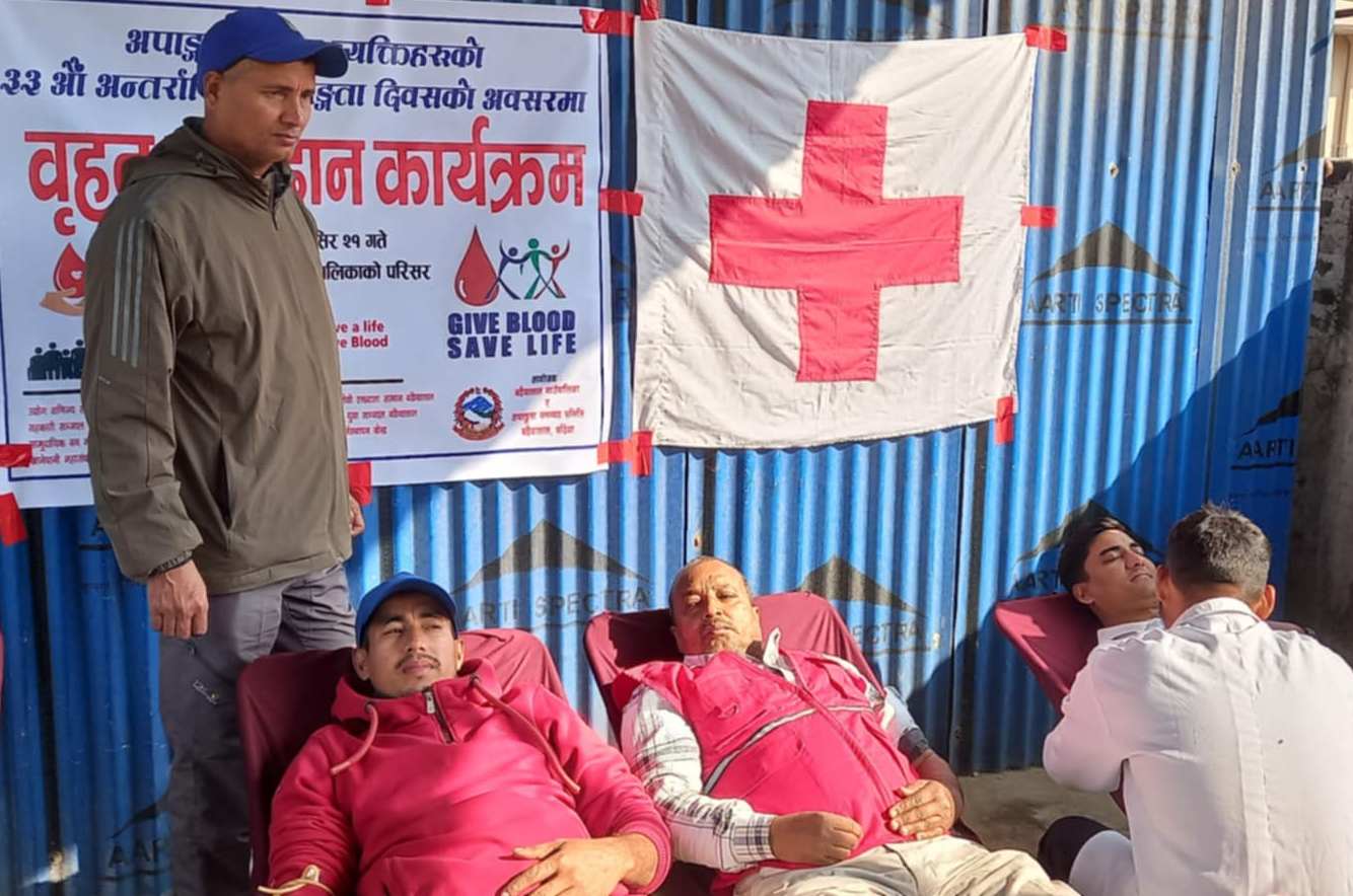 नेपालगञ्ज/(बाँके) पवन जायसवाल । बर्दिया जिला के मैनपोखर में ३३ वींं अन्र्तराष्ट्रीय अपाङ्गता दिवस के अवसर पर “रक्तदान जीवनदान” मूल नारा के साथ आयोजित बृहत रक्तदान कार्यक्रम में जनप्रतिनिधि, कर्मचारी, सुरक्षाकर्मी, व्यापारी सहित ६ महिला ६४ लोग पुरुष करके ७० लोगों ने रक्तदान किया है ।