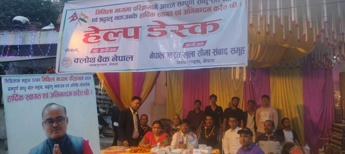 जनकपुरधाम, धनुषा, नेपाल – नेपाल-भारत खुली सीमा संवाद समूह और क्लोथ बैंक नेपाल के संयुक्त आयोजन में मिथिला मध्यमा परिक्रमा के अंतर्गत श्रद्धालु भक्तजनों, साधु-संतों और सभी यात्रियों के स्वास्थ्य और सुविधाओं को ध्यान में रखते हुए 15 दिवसीय परिक्रमा के लिए आज से हेल्पडेस्क का संचालन किया गया। क्लोथ बैंक नेपाल के कार्यालय सचिव कृष्ण कुमार साह ने बताया कि हेल्पडेस्क नेपाल की ओर से पड़ने वाले 11 पड़ावों (वासाओं) में संचालित किया जाएगा।