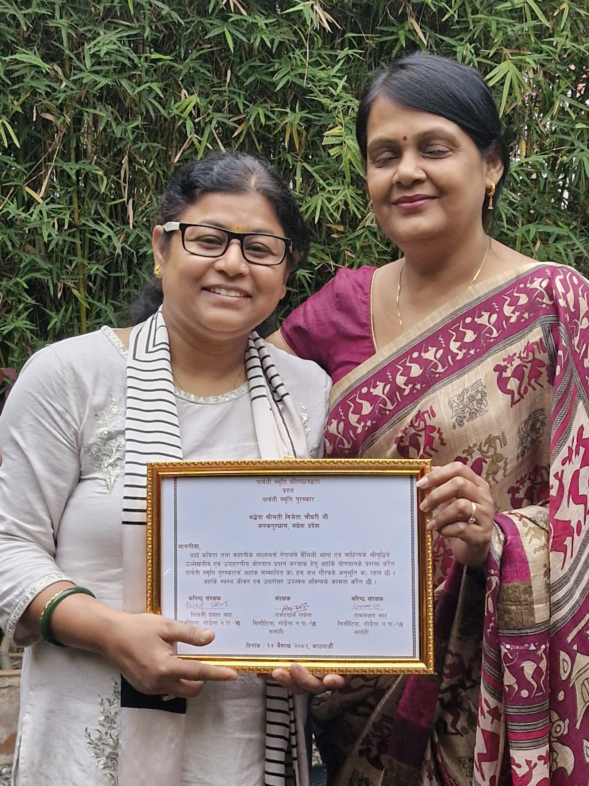 काठमान्डू २७ अप्रैल मैथिली साहित्य में योगदान हेतु युवा लेखिका विजेता चौधरी को पार्वती स्मृति संस्थान द्वारा पुरस्कृत और सम्मानित किया गया है । संस्थान द्वारा आयोजित कार्यक्रम में ११०० रु राशि का पुरस्कार एवं प्रशस्ति पत्र प्रदान किया गया । कार्यक्रम की अध्यक्षता डा। तुलसी दिवस जी ने की और प्रमुख अतिथि का निर्वहन साहित्यकार एवं पत्रकार धर्मेन्द विह्वल जी ने किया ।