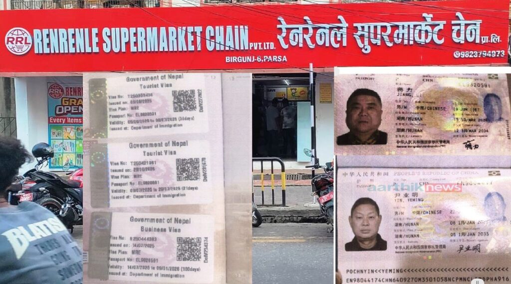 अनिल तिवारी, वीरगंज। नेपाल के व्यापारिक केंद्र वीरगंज के आदर्शनगर चौक पर पिछले एक महीने से “रेनरेनले सुपरमार्केट” नामक एक दुकान संचालन में है, जिसे प्रत्यक्ष रूप से दो चीनी नागरिक चला रहे हैं। स्थानीय व्यापारी देवकी अग्रवाल की तीन मंजिला इमारत को इन चीनी नागरिकों ने मासिक 2 लाख 60 हजार रुपये में किराए पर लिया है, जिसमें से दो मंजिल पर वे स्वयं स्थानीय स्टाफ के साथ रह रहे हैं।