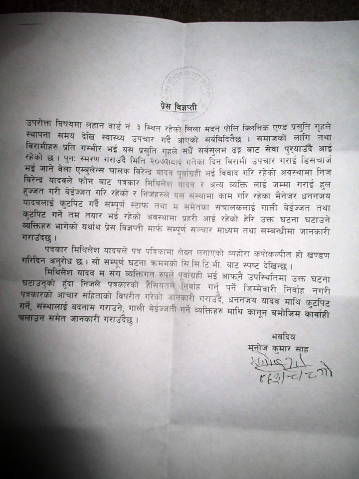 लाहान ३, सिरहा में अवस्थित लिलामदन पोलीक्लिनिक एण्ड प्रसुती गृह में मंसिर ६ गते हुए विवाद सम्बन्धी पत्रकार सम्मेलन वुधवार को किया गया । पत्रकार सम्मेलन में वितरण किया गया प्रेस विज्ञप्ति के अनुसार मंसिर ६ गते एक पेसेन्ट उपचार के वाद डिसचार्ज होकर जाते वक्त एम्बुलेन्स ड्राइवर विरेन्द्र यादव ने मोबाईल सम्पर्क मे नागरिक दैनिक के पत्रकार मिथिलेश यादव और कुछ व्यक्ति को जमा करके प्रसुती गृह में गाली बेइज्जती करने का आरोप है । इस के साथ ही विवाद के क्रम में क्लिनिक के मेनेजर धनन्जय यादव, प्रसुती गृह के संचालक मनोजकुमार साह और कर्मचारी उपर मार पीट का प्रयास करने की बात जारी विज्ञप्ती में उल्लेखित है । पत्रकार मिथिलेश यादव ने पत्रपत्रिका तथा समाजिक संजाल फेसबुक में उल्टा समाचार लेखन करने करवाने का आरोप है । जबकि सिसिटीभी क्यामरा द्धारा लिए गए फुटेज कुछ और बयान करता है । विज्ञप्ती मे प्रसुती गृह के संचालक मनोजकुमार साह का ये दावा है कि मिथिलेश यादव मुझसे व्यक्तिगत रुप से पूर्वाग्राही होकर अपनी उपस्थिति में उक्त घटना को अंजाम देने के कारण निज पत्रकार की हैसियत से निर्वाह करनेवाला काम ना कर के पत्रकार आचार संहीता के विपरित काम किया है । तसर्थ प्रसुती गृह के धनन्जय यादव उपर मारपीट , संस्था को बद्नाम करने, गाली बेईज्जती करने व्यक्ति उपर कानुन बमोजिम कारवाही करने के लिए सम्बन्धित निकाय संग माग करने का जिक्र विज्ञप्ती में उल्लेख है । पत्रकार सम्मेलन के क्रम मे प्रसुती गृह के धनन्जय ने कहा कि करीब १०, १२ बर्ष पहले मिथिलेश यादव के साथ मेरा विवाद हुवा था । आज इसी रिसिवी मे मुझे गैंग बोलाकर मारपीट करने का प्रयास किया है । उधर संचालक साह ने कहा कि कुछ दिन पहले मिथिलेश एक पेसेन्ट लेकर आया था । उस वक्त गाड़ी में रहे पेसेन्ट को केनुला लगांने का दवाव दिया था मगर हमारे स्वास्थ्यकर्मी ने नहीं माना इसी के कारण ऐसा आक्रमण का प्रयास हुवा है । उधर, मिथिलेश समाचार संकलन के क्रम में मेरे उपर आक्रमण का प्रयास होने का दावा कर रहे है । ईस घटना का ग्राउन्ड रियालिटी सिसिटीभि क्यामरे मे कैद है जो दूध का दूध और पानी का पानी कर दिया है । इशारा पत्रकार के उपर जा रहा है ।