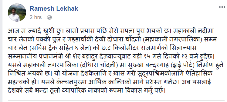 कांग्रेस नेता रमेश लेखक ने अपनी फेशबुक में लिखे हैं कि पूल बनने के कञ्चनपुर आर्थिक क्रान्ति की ओर आगे बढ़ेगा । उन्होंने लिखा है– ‘मैं आज हर्षित हो रहा हूं, कई प्रयासों के बावजूद मेरा सपना पूरा हो रहा है ।’ बताया गया है कि कूल ३ अरबों की लागत में पूल निर्माण की जाएगी । उक्त परियोजना की सम्पूर्ण लागत नेपाल सरकार द्वारा की जाएगी । इसीतहर गड्डा चौकी–महाकाली नदी से पार दोधारा चाँदनी में सर्भिस ट्रयाक सहित ६ लेन की पक्की सडक भी निर्माण होगा । जो ७.८ किलोमिटर लम्बा है । कांग्रेस नेता लेखक ने लिखा है कि अब इसको सबसे बड़ा व्यापारिक केन्द्र के रुप में विकास करना चाहिए ।
