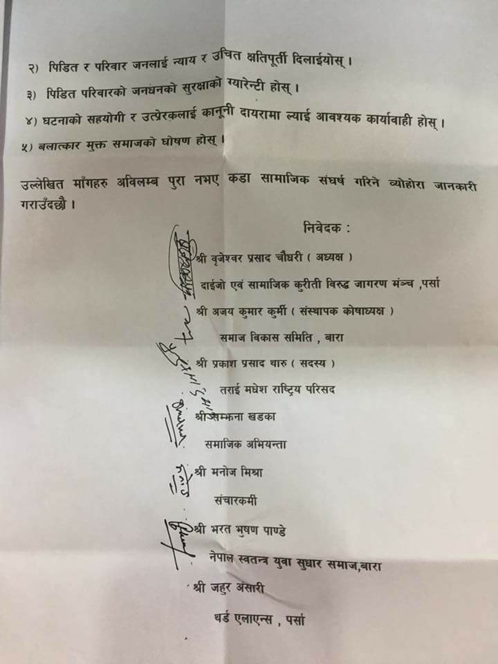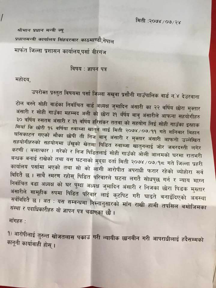 वीरगंज २४ कार्तिक पर्सा जिल्ला के सखुवा प्रसौनी गाउपालिका वड़ा ४ के रहने वाली 16 बर्षीय रूवाबजा खातुन को सामुहिक बलात्कार करने वाले को सजा की मांग करते हुये अधिकारकर्मीयों ने सीडीओ को ज्ञापन पत्र सौंपा है। मिति 2074 कार्तिक 11 गते के समय मे खेत मे घास के लिए जा रही ख़ातून को प्रसौनी गाउपालिका के रहने वाले बड़ा अध्यक्ष जुमादिन अंसारी के 22 बर्षीय बेटा मुक्कतार अंसारी, महमद अली का बेटा 31 बर्षीय बाबु अंसारी और गाउ के ही सहयोगी 30 बर्षीय रुस्तम अंसारी, 31 बर्षीय हरिशंकर तत्वा इस घतना को अन्जाम दिया है। अभी तक पुलिस ने किसी आरोपी को नही पकड़ा है इस लिए बाध्य होकर अधिकारकर्मीयों ने आज पर्सा जिल्ला के प्रमुख जिल्ला अधिकारी बिनय प्रकाश सिंह को 5 बुदै ज्ञापन पत्र सौंपा है। मुख्य रूप मे दोसी को कारवाही हो, बलात्कार मुक्त समाज निर्माण हो, कानून बमोजिम सजा हो ,पीड़ित को न्याय और उचित छतिपूर्ती मिले और पीड़ित परिवार की सुरक्षा गैरन्टी होना पड़ा। सीडीओ ऑफिस जाने वाले सामाजिक अभियन्ता लोगगण ब्रिजेसवर चौधरी, अजय कुर्मी, प्रकाश थारू,समझना ढकाल, मनोज मिश्रा, भारत भूषण पाण्डे, जहूर अंसारी सहित के लोगो ने लिखित हस्ताक्षर सौपा है सिडिओ मार्फत प्रधानमंत्री शेरबहादुर देउवा को दिया है।