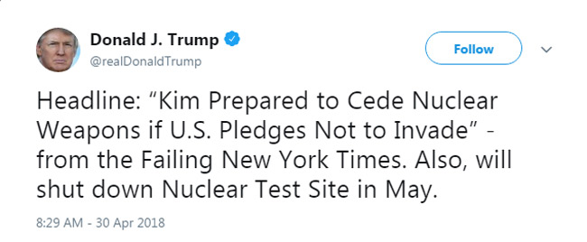 अमेरिकी राष्ट्रपति डोनाल्ड ट्रंप ने भी ट्विटर हैंडल पर उत्तर कोरिया के नेता किम जोंग उन की परमाणु हथियारों को लेकर शर्त वाली खबर की हेडलाइन को ट्वीट किया है।