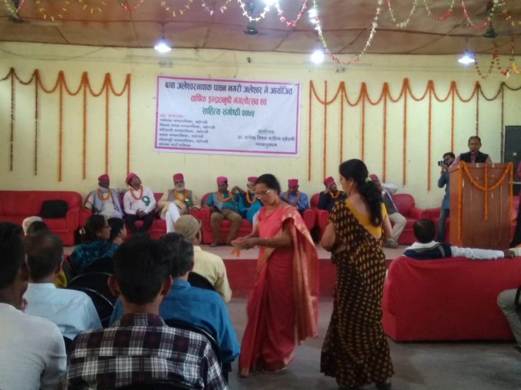 आज 2075 चैत्र 16 गत्ते जलेश्वर स्थित जिल्ला विकाश के सभाकक्ष में डा.राजेन्द्र विमल साहित्य एकेडमी जनकपुर धाम के संयोजकत्व में वृहद् साहित्य संगोष्ठी कार्यक्रम रखा गया। श्री महेन्द्र कुमार मिश्र जी के अध्यक्षता में सुशोभित इस कार्यक्रम में प्रमुख अतिथि के रूप में डा.भरत झा जी तथा विशिष्ट अतिथि त्रय श्री रामशंकर मिश्र, श्री संजय सिंह,श्री हरिनारायण मंडल जी थें। आज इस सभाकक्ष में 40 से अधिक महिला और पुरुष कवि साहित्यकारों की उपस्थित देखा गया। जनकपुर लगायत देश के राजधानी से पधारे साहित्य प्रेमी महिमावान व्यक्तियों से खचाखच भरा यह हाल कार्यक्रम की सफलता का गरिमागान गा रहा है। प्रदेश नंबर दो के प्रत्येक गाव में साहित्यिक अभियान को गतिशील करने हेतु संकल्पित यह संस्था तीन वर्षों में ही लोहारपट्टी और मनरा नगरपालिका तक अपनी पहुँच बना ली है। हरेक भाषा को हृदयंगम कर साहित्य के प्रति आम जन मानस और युवाओं आस्था और जागृति बढ़ाने का पावन उद्देश्य से सक्रिय यह एकेडेमी कम समय में ही अपनी शिखर को चूमने लगी है। काव्य में अश्लीलता और क्षुद्रता का वहिष्कार किया जाय, एतिहासिक धरोहर, सामाजिक उत्थान, वैज्ञानिक सोच तथा सांस्कृतिक विरासत के आधार को साहित्यिक सृजना का मुख्य विषय बनाने के लिए साहित्यकारों को प्रेरित होना चाहिए। उपस्थित कवियों ने भ्रष्टाचार,अत्याचार,बलात्कार, जराजीर्ण सड़क,वेहाल किशान और राजनीति पर तीखे व्यंग किए। इस कार्यक्रम में मिथिला के सांस्कृतिक विरासत को झलकाने वाला प्रेरक नृत्य प्रस्तुत किया गया था। स्थानीय सामाजिक कार्यकर्ता तथा वाहर से आए साहित्यकारों को सम्मानित किया गया। कार्यक्रम में प्रभावकारी उदघोषण पत्रकार प्रभु मिश्रा ने संभाला।