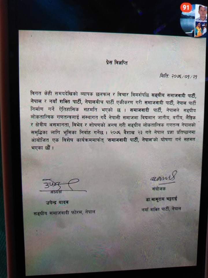 आज डॉ बाबूराम भट्टराई की नयाँ शक्ति पार्टी और उपेन्द्र यादव वाली संघीय समाजवादी पार्टी ने एक नया पार्टी का जन्म दिया है । नया पार्टी का नाम समाजवादी पार्टी नेपाल रखा गया है । नीचे विज्ञप्ति है ।