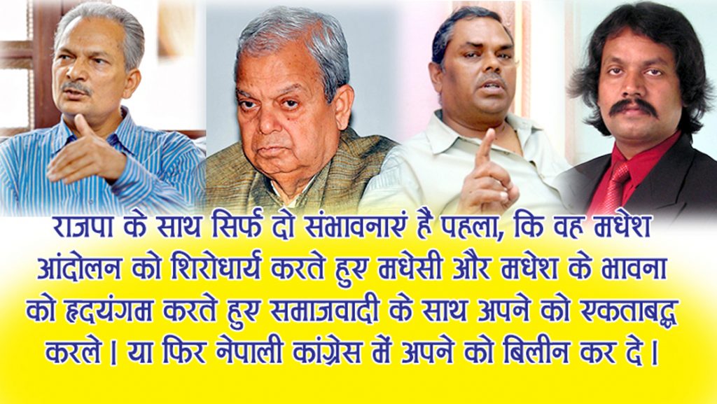 राजपा के साथ सिर्फ दो संभावनाएं हैं पहला, कि वह मधेश आंदोलन को शिरोधार्य करते हुए मधेसी और मधेश के भावना को हृदयंगम करते हुए समाजवादी के साथ अपने को एकताबद्ध करले। या फिर नेपाली कांग्रेस में अपने को बिलीन कर दे।