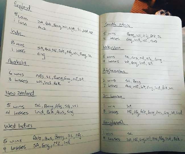 क्रिकेट का महाकुंभ यानी आइसीसी वर्ल्ड कप शुरू हो गया है और अभी तक दो मैच खेले भी जा चुके हैं। वर्ल्ड कप शुरू होने से पहले ही भविष्यवाणियों का दौर भी शुरू हो गया है, जिसमें दिग्गज खिलाड़ियों से लेकर क्रिकेट एक्सपर्ट अपनी अपनी भविष्यवाणी कर रहे हैं। अब इस क्रम में न्यूजीलैंड के पूर्व बल्लेबाज ब्रेंडन मैक्कुलम का नाम भी जु़ड़ गया है, जिन्होंने सिर्फ वर्ल्ड कप सेमीफाइनल को लेकर ही नहीं बल्कि हर एक टीम को लेकर भविष्यवाणी की है। उन्होंने एक कागज पर लिखकर यह जानकारी दी है कि कौन सी टीम कितने मैच जीतेगी और किससे हार का सामना करना पड़ेगा।