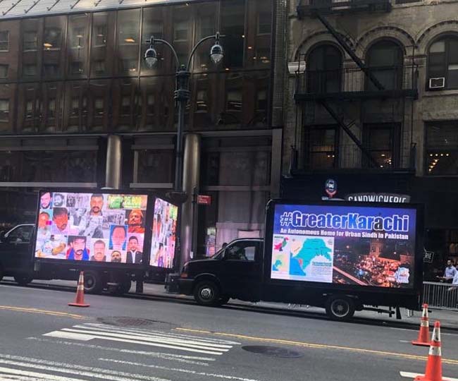 संयुक्त राष्ट्र के मुख्यालय के आसपास घूमते हुए इन वाहनों की डिजिटल स्क्रीन पर लिखा था, ‘पाकिस्तान ऐसा देश है जो मानवाधिकार पर संयुक्त राष्ट्र के चार्टर को नहीं मानता और मुहाजिर पाकिस्तान में संयुक्त राष्ट्र के दखल की मांग करते हैं।’